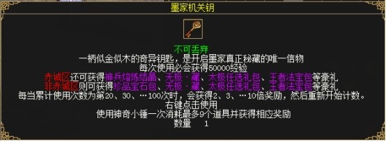 玩家每次开启墨家机关钥必得50000经验。 玩家累计开启20、30、…90、100个抽奖包,则第20、30、…90、100次开启抽奖包获得2、3、…9、10倍奖励,然后重新开始计数