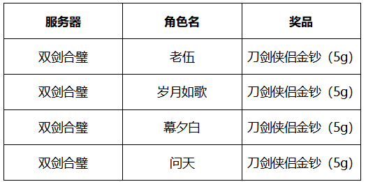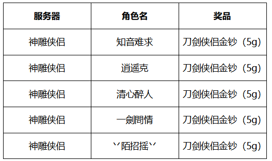 11月新服在线抽刀剑侠侣金钞(5g)活动已于12月4日结束,获奖名单如下: