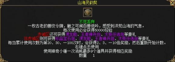 玩家每次开启山海灵韵契必得50000经验。玩家累计开启20、30、…90、100个抽奖包,则第20、30、…90、100次开启抽奖包获得2、3、…9、10倍奖励,然后重新开始计数。