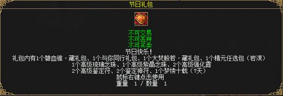 节日礼包奖励内容:大梵般若·藏礼包*1、碧血锥•藏礼包*1、与你同行礼包*1、精元任选包(岩溟)*1、梦续十载(7天)*1、鉴定神符*2、高级鉴定符*2、高级强化露*2、高级琉璃念珠*1、高级紫晶念珠*1及大量经验。(奖励均为绑定物品)