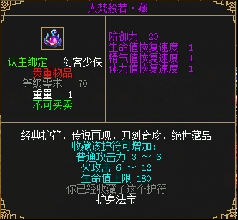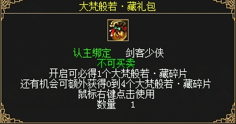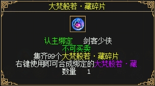 1、使用99个大梵般若·藏碎片可以合成1个大梵般若·藏,收藏可增加普通攻击力3~6,火攻击6~12,生命值上限180。