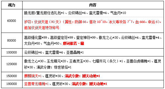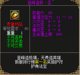 第1名:10万元宝,护符:登峰造极·圣(绑定):防御95,普攻11~13,冰火毒攻8~9,血950;