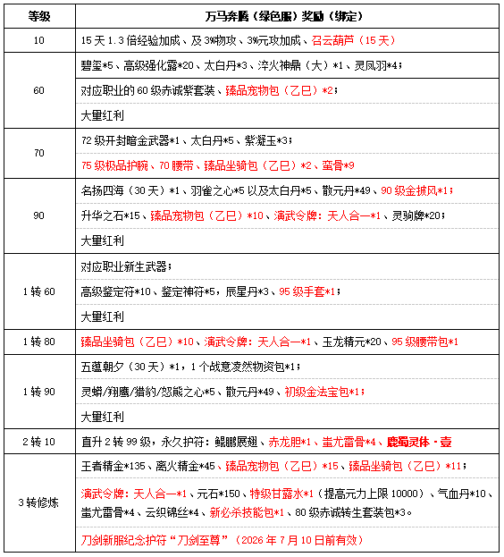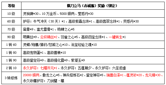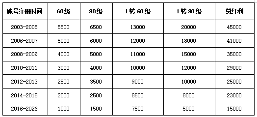 玩家达到60级、90级、1转60级、1转90级时还可根据账号注册时间获得不同量级的红利奖励。