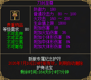 绿色新服,无限时类抽奖包道具;赤诚新服,武器最高为神武、头衣鞋最高为赤诚部件,其他装备上限最高为王者四件、王者法宝、太极宠物、王者项链、王者扳指,无三满宝石。并且上述限制为永久。绿色服&赤诚服携手登场,装备差距小,PK精彩刺激,帮战人气火爆!