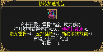 2026年3月6日至2026年4月4日期间,玩家在新服单次兑换100元宝及以上元宝,即可获得绑定的太白丹*20,高级水晶念珠*1,高级琉璃念珠*1,高级菩提念珠*1以及金龙精元*20、岩龙精元*20,青龙胆。奖励只可获得一次。