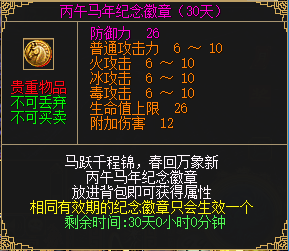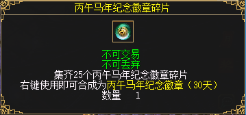 25个丙午马年纪念徽章碎片可合成丙午马年纪念徽章(30天)。每日只可领取一次,可持续领取30天。