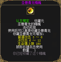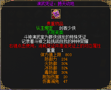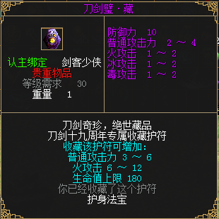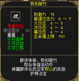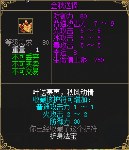 ②绑定永久护符“傲视群雄”属性:防御80,普攻7~8,火攻5~5,冰毒攻击各4~5,生命上限750
