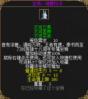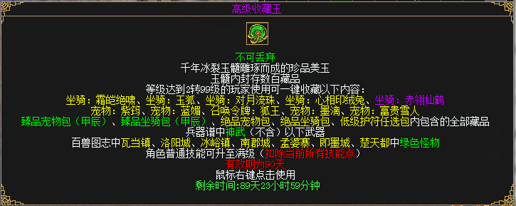使用收藏玉可以一键收藏坐骑、宠物、护符、精魄、武器等共计300个,一键将普通技能升至满级(不包含角色必杀技、修炼技能、套路)。