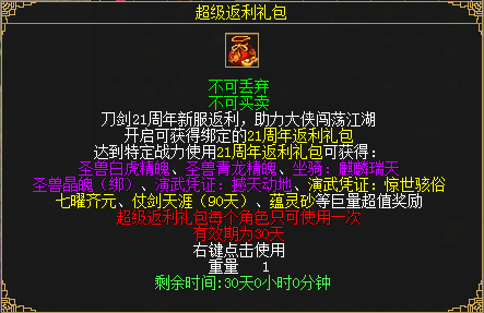 2026年3月6日至2026年4月4日期间,新服庙会上架“超级返利礼包”。庙会上架的“超级返利礼包”为可交易,“超级返利礼包”需要在购买后30天内使用,一个角色只能使用一次,使用“超级返利礼包”可以获得绑定的“21周年返利礼包”(有效期360天)