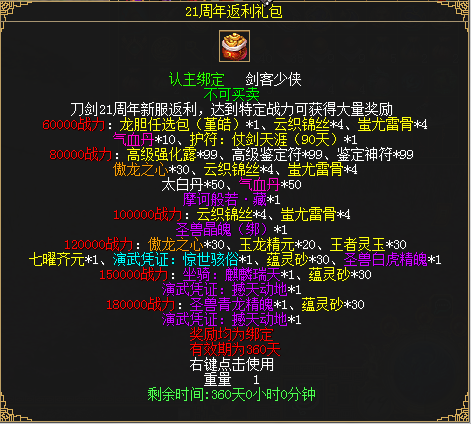 角色达到对应战力后使用“21周年返利礼包”可以获得以下物品: