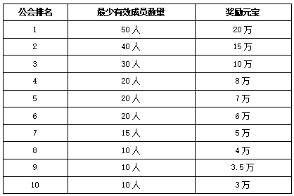 如果排名对应公会的有效成员数量不满足最小有效成员数,则奖励元宝数量向下调整为满足最小成员数量档次元宝。例如,如果排名第2的有效成员数量为21人,则奖励元宝数量为第4名对应元宝8万元宝。