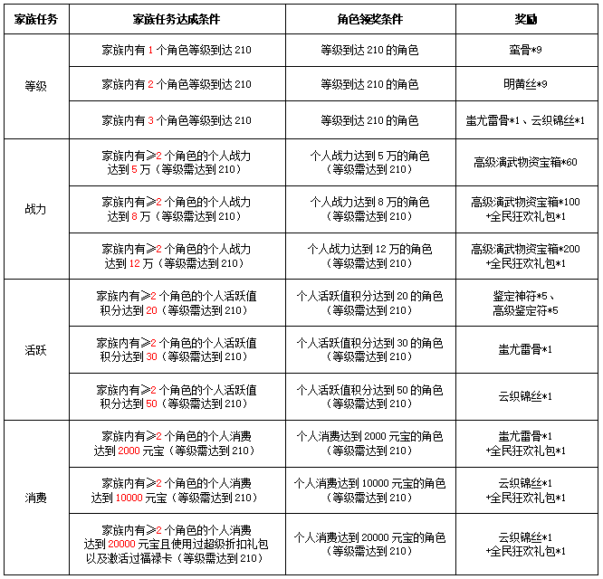 活动期间,当家族到达以下条件,满足条件的玩家可以通过“新服狂欢”界面“全民狂欢”领取对应奖励。