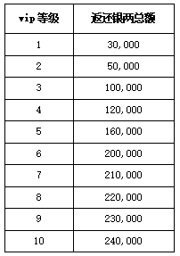 2026年3月6日至2026年3月27日期间,VIP玩家登录新服,进入“新服狂欢”界面“VIP消费返还”可以领取银两返还奖励,各VIP返还银两数量如下: