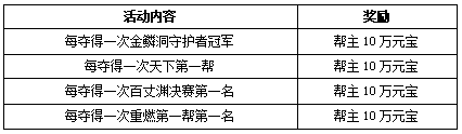 ② 奖励可累加,最高可拿到70万元宝。例如A帮会活动期间夺得2次金鳞洞冠军和1次天下第一帮,则A帮会帮主可获得30万元宝。