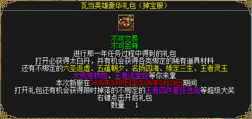 2026年3月6日至2026年5月24日期间,玩家参加那一年任务,成功连击BOSS有机会获得瓦当英雄豪华礼包(掉宝服),打开瓦当英雄豪华礼包(掉宝服)有机会获得不绑定的王者四件套任选礼包等超级大奖,还有机会获得不绑定的六圣返虚、五蕴朝夕、名扬四海、缘定三生、王者灵玉等稀有道具。