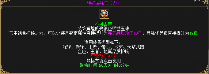使用鉴强玉可以一键让装备鉴定属性直接提升至完美品质生命/攻击/火攻10星,且强化等级直接提升至19级。