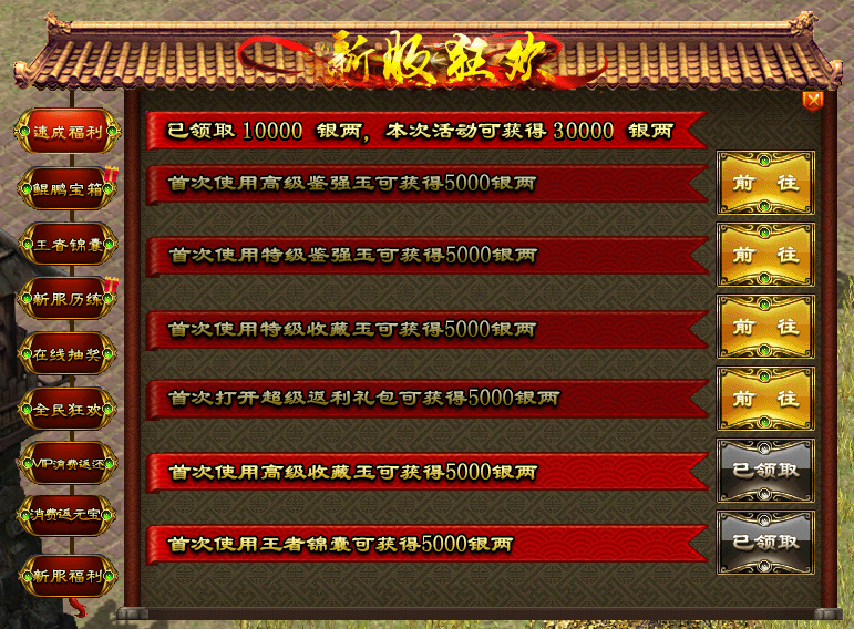 活动期间,首次使用速成等相关道具的玩家还有额外大量银两奖励。点击主界面新服狂欢按钮,可打开新服狂欢界面,选择“速成福利”,完成相应任务,即可获得对应的银两奖励,最高可获得30000银两。
