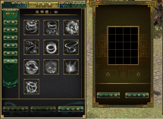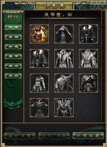 侠影集分别按照时装,武器,头盔,盔甲,披风,光环等部位展示了本职业的可收藏外观。