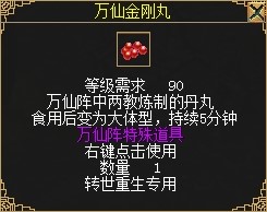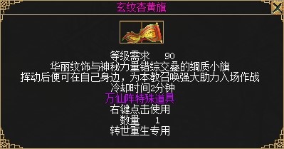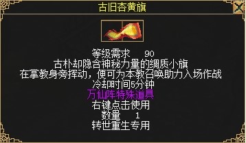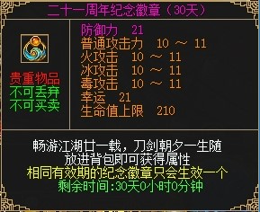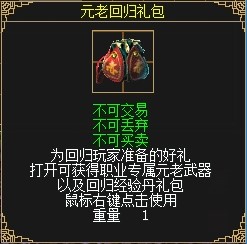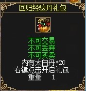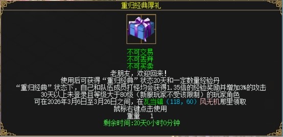 使用重归经典厚礼道具将会获得“重归经典”状态,有“重归经典”状态的玩家或者与此玩家组队的玩家将会获得1.35倍的杀怪经验,状态效果持续20天,持续20天内每天上线获得15点活跃值。并给队员和自己加3%物攻、3%元攻加成。同时将获得镇星丹*9、岁星丹*9、荧惑丹*35、太白丹*40以及“元老回归礼包”。