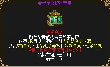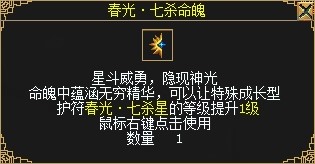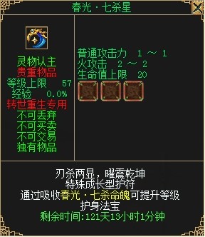 同时,3转修炼玩家还可以在西凉城(138,116)周复始处领取多种春光季专属奖励。包括新型的可成长护符:春光•七杀星,专属升级材料:春光•七杀命魄,以及专属镶嵌石:春光•七杀晶核。