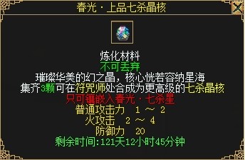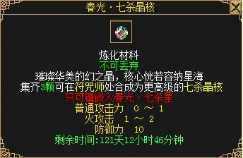 春光•七杀晶核可通过炼化提升到更高等阶,3颗春光•七杀晶核可升为春光•上品七杀晶核,3颗春光•上品七杀晶核可升为春光•极品七杀晶核,3颗春光•极品七杀晶核可升为春光•珍品七杀晶核。各等级春光•七杀晶核炼化、镶嵌、摘除均没有任何额外消耗,但摘除后将变为绑定。