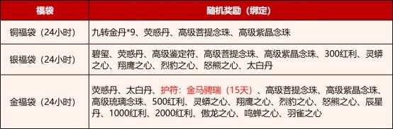活动期间,所有≥80级的玩家(转生不受等级限制)每天开启活跃值铜宝箱可以额外获得酥雨福袋*1和2000红利、铜福袋(24小时*1),每天开启活跃值银宝箱可额外获得一个绑定的银福袋(24小时*1),每天开启活跃值金宝箱可额外获得一个绑定的金福袋(24小时*1)。