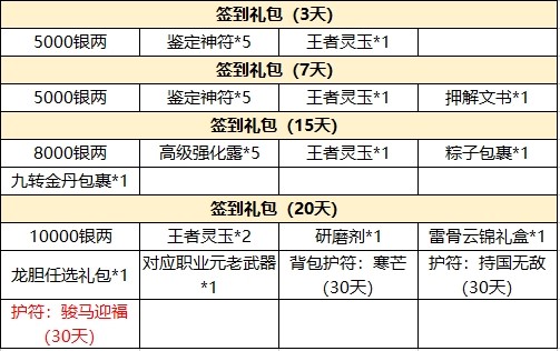 签到20天可得:10000银两,1个研磨剂,2个王者灵玉, 1个雷骨云锦礼盒,1个龙胆任选礼包,对应职业元老武器,背包护符:寒芒(30天),护符:持国无敌(30天),护符:骏马迎福(30天)。