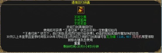 使用通缉回归礼包可获得王者归来光环,持续20天。20天内每天上线即可获得15点活跃值,与活跃玩家组队杀怪,均可获得1.45倍经验。并给队员和自己加5%物攻、5%元攻加成。同时将获得镇星丹*9、岁星丹*9、荧惑丹*35、太白丹*40以及“元老回归礼包”。当角色带有王者归来的光环时可叠加使用通缉回归锦囊,最多叠加60天状态。