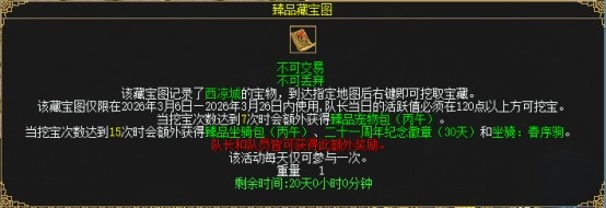 所有玩家累计挖宝7次可额外获得臻品宠物包(丙午),15次可额外获得臻品坐骑包(丙午)、二十一周年纪念徽章(30天)和坐骑:春序驹