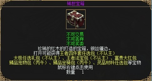 每次开启藏宝图两人必得1000银两,还可获得稀世宝箱或精致宝箱,开启宝箱有概率获得王者四件套任选包、太极宠物包、王者法宝包、富贵大红包、臻品宠物包(丙午)、臻品坐骑包(丙午)、灵品材料任选包等奖励。