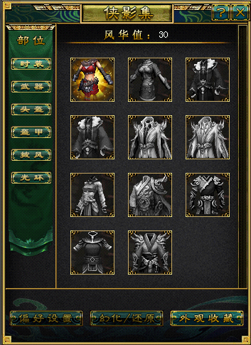 等级达到2转99级的稻米,可以点击游戏界面内的“侠影集”按钮进入侠影集界面。在侠影集功能中,展示了本职业可收录外观,包含时装、武器、头盔、盔甲、披风、光环等部位,各部位外观可自由搭配。