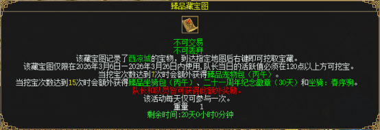 符合条件的稻米每日可前往西凉城的张岩(100,154)领取1张臻品藏宝图,老友玩家右键臻品藏宝图即可挖宝。每次开启藏宝图两人必得1000银两,还有机会获得王者四件套任选包、太极宠物包、王者法宝包、富贵大红包、灵品材料任选包等奖励。