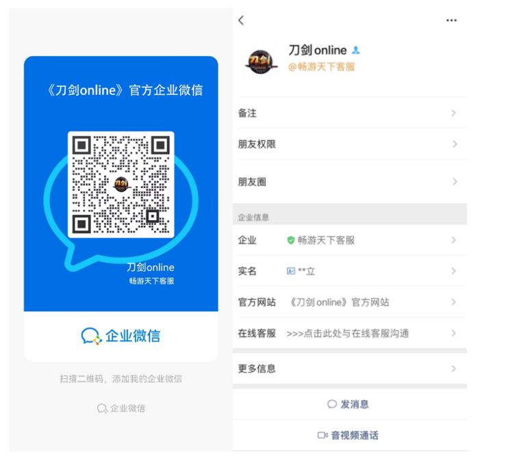 微信扫描下方二维码添加官方企业微信号“刀剑online@畅游天下客服”,即可获取官方企业微信福利礼包,还有官方玩家交流群等你加入哦。