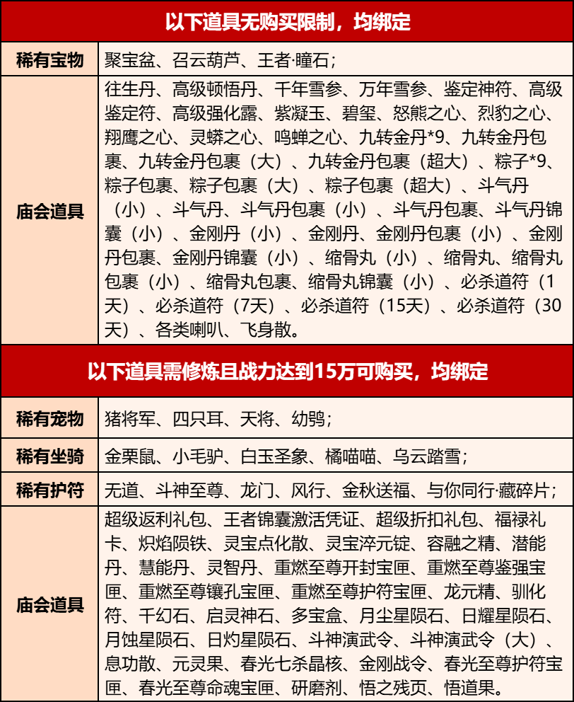 活动期间,新服稻米消耗元宝返利20%,即每累计消耗5元宝就可以返还1绑定元宝,返还无上限。绑定元宝可购买以下物品: