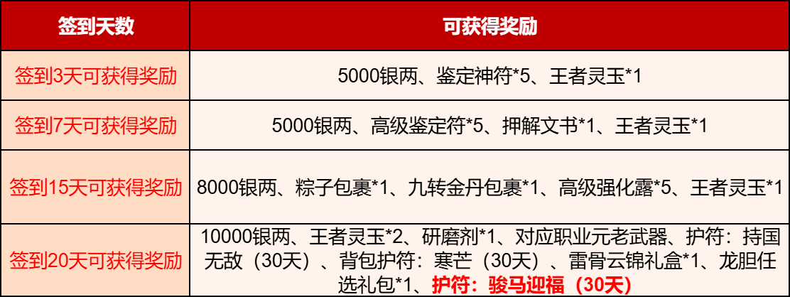3月6日9:00至3月30日24:00期间,所有≥80级的稻米(转生不受等级限制)累积日历签到3天、7天、15天和20天,可获得签到礼物,包含背包护符:寒芒(30天),护符:持国无敌(30天),护符:骏马迎福(30天)等。