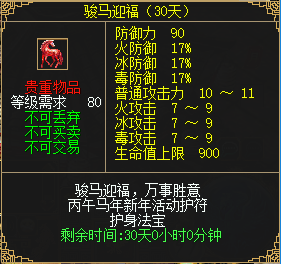 礼包包含以下内容:高级菩提念珠*1、高级紫晶念珠*1、高级琉璃念珠*1、傲龙之心*1、王者灵玉*1、护符:骏马迎福(15天),40级以上角色激活,同样需要前往瓦当镇NPC礼品专员处激活。