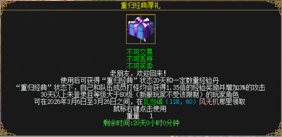 打开礼包可获得专属状态光环和大量经验丹,同时获得1个“元老回归经验丹礼包”。拥有状态的老友稻米组队打怪,可以和队伍成员一起享受加倍经验和攻击力。