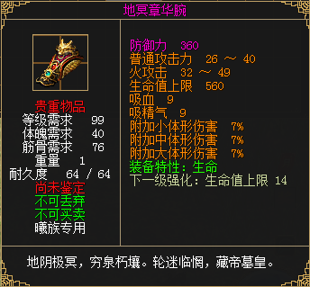 王者护腕升级为地冥护腕后,原开封属性保留,可以使用傲龙之心重洗为上限更高的开封属性(例:普攻最高5-14,火攻最高10-31)。
