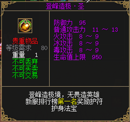 第1名:10万元宝,护符:登峰造极·圣(绑定):防御95,普攻11~13,冰火毒攻8~9,血950;