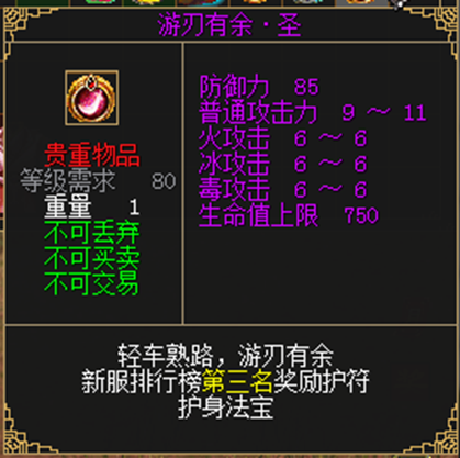 第3名:3万元宝,护符:游刃有余·圣(绑定):防御85,普攻9~11,冰火毒攻6~6,血750;