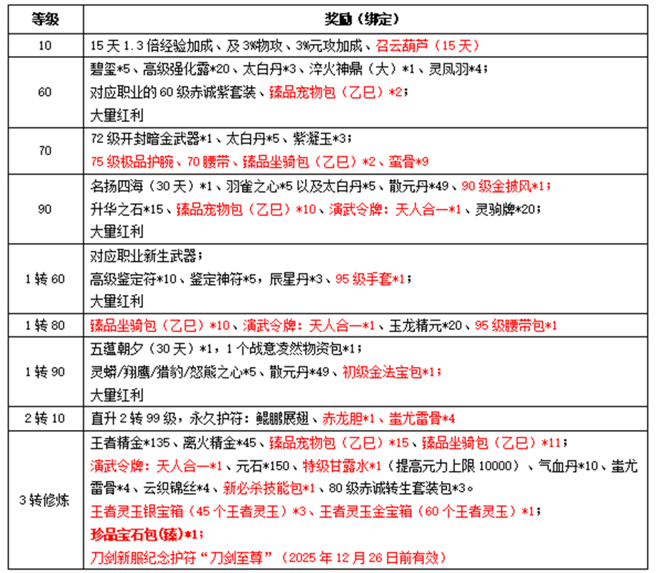 玩家达到60级、90级、1转60级、1转90级时还可根据账号注册时间获得不同量级的红利奖励。