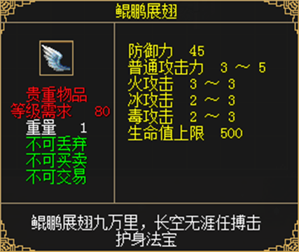 ②绑定永久护符“傲视群雄”属性:防御80,普攻7~8,火攻5~5,冰毒攻击各4~5,生命上限750