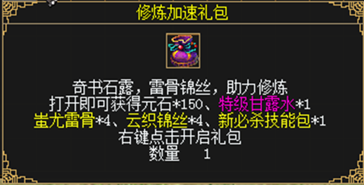 2025年8月22日至2025年9月20日期间,玩家在新服单次兑换100元宝及以上元宝,即可获得绑定的太白丹*20,高级水晶念珠*1,高级琉璃念珠*1,高级菩提念珠*1以及金龙精元*20、岩龙精元*20,青龙胆。奖励只可获得一次。