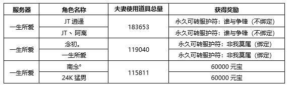 活动期间,根据两组新服夫妻两人使用活动道具的总数量进行排名,两组新服合并排名,恭喜以下玩家获得奖励。