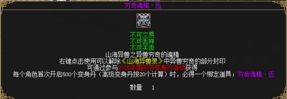 每个角色首次开启500个变身丹时(变身丹按1个计数,高级变身丹按20个计数),必得一个绑定的道具:穷奇魂精•伍。