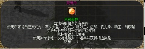 玩家使用变身丹会随机变为腌臜鬃、狼王、豹先锋、应熊、妖狐王、冰羌王、草头大圣其中一种,,并获得经验奖励。