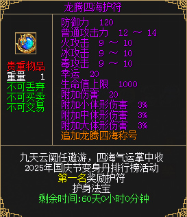 每个服务器第一名可获得绑定护符:龙腾四海(60天),防御120,攻击12-14,冰火毒攻各9-10,幸运20,生命上限1000,附加伤害20,附加小/中/大体型伤害各3%,追加龙腾四海称号;