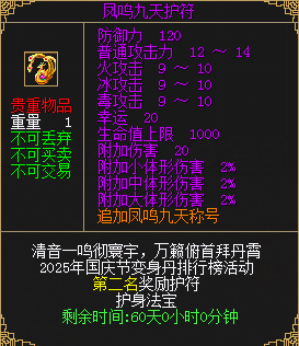 每个服务器第二名可获得绑定护符:凤鸣九天(60天),属性:防御120,攻击12-14,冰火毒攻各9-10,幸运20,生命上限1000,附加伤害20,附加小/中/大体型伤害各2%,追加凤鸣九天称号;