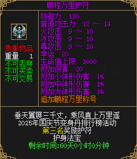 每个服务器第三名可获得绑定护符:鹏程万里(60天),属性:防御120,攻击12-14,冰火毒攻各9-10,幸运20,生命上限1000,附加伤害20,附加小/中/大体型伤害各1%,追加鹏程万里称号;