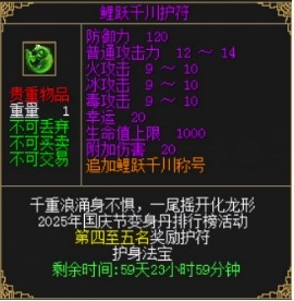 每个服务器第四到五名每人可获得绑定护符:鲤跃千川(60天),防御120,攻击12-14,冰火毒攻各9-10,幸运20,生命上限1000,附加伤害20,追加鲤跃千川称号;